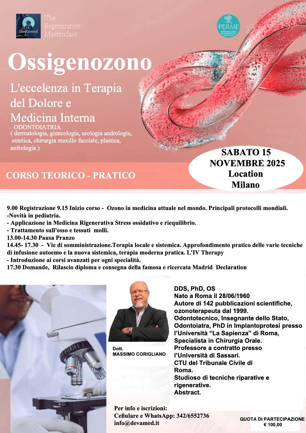 Il corso sarà tenuto dal Dott. Massimo Corigliano, odontoiatra e ozonoterapeuta dal 1999, specialista in chirurgia orale, professore a contratto presso Università di Sassari e Sapienza Università di Roma.